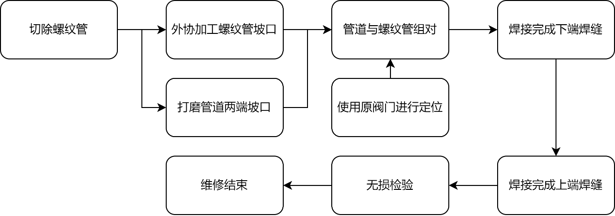 螺纹管段可转运至其它地方进行机加工坡口,管道段就地加工。在条件允许(具有坡口机)的情况下,按焊接工艺打V型坡口;在不具有坡口机的情况下,管道端采用手工砂轮机打磨焊接坡口,螺纹管段按焊接工艺打单边V型坡口。